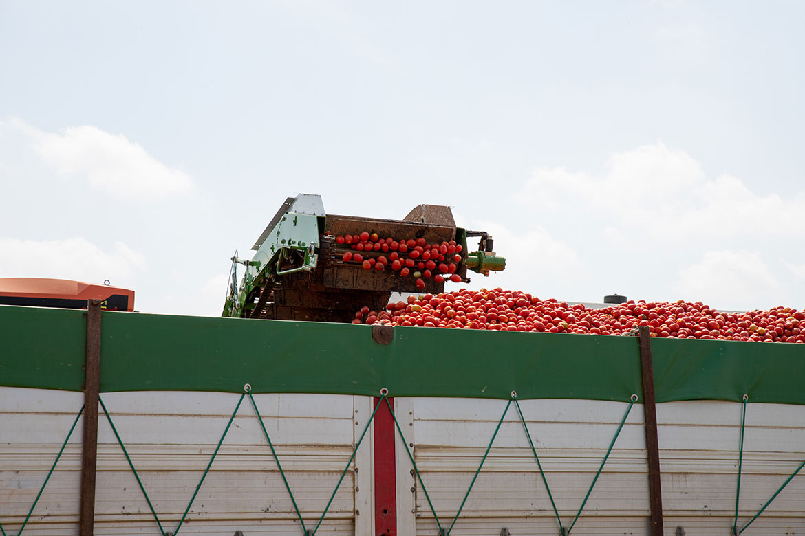 Mehr noch: Damit die Produktqualität möglichst hoch ist, müssen wir die Verarbeitung der frischen Rohwaren direkt vornehmen. Schließlich verwenden wir hier vollreife Tomaten. Der Vollernter transportiert die reifen, roten Tomaten über ein Förderband direkt auf den LKW. Der fährt immer mit, so sparen wir Zeit und müssen die Rohwaren nicht in einem separaten Schritt verladen.